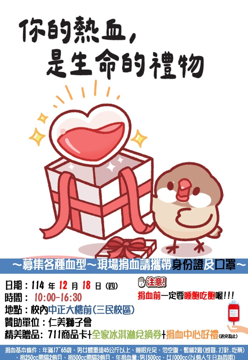 1. 捐血即可獲得小禮物一份,歡迎大家發揮愛心踴躍參加!