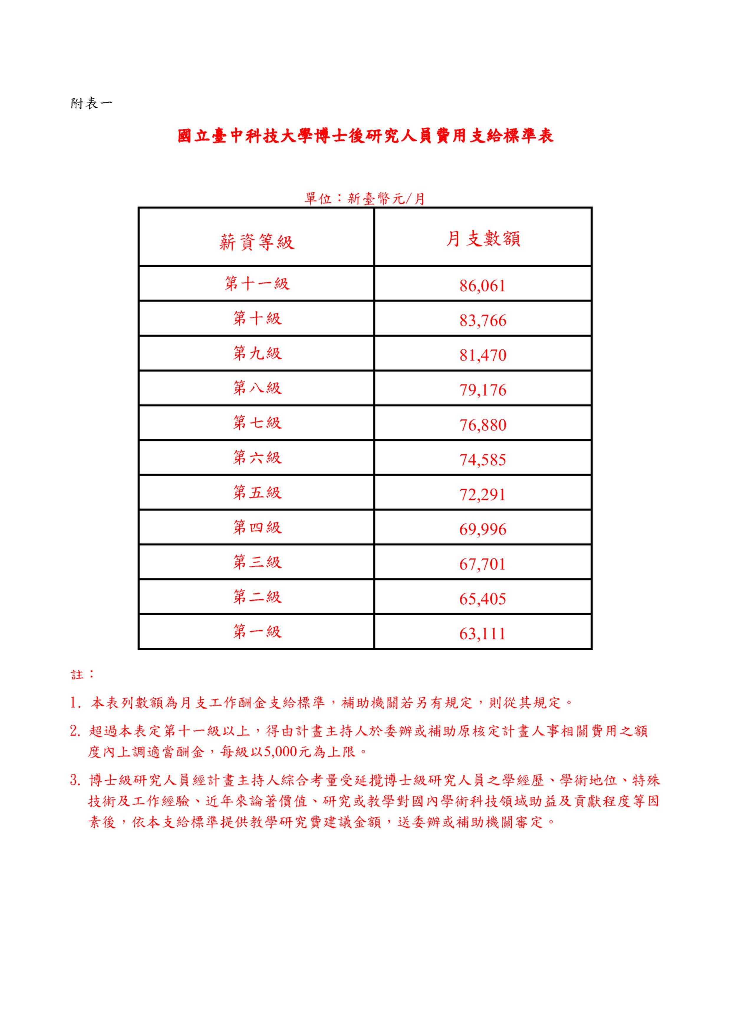A:國立臺中科技大學執行國科會(原科技部)補助專題研究計畫專任助理月支工作酬金對照表【114/02/11更新】
