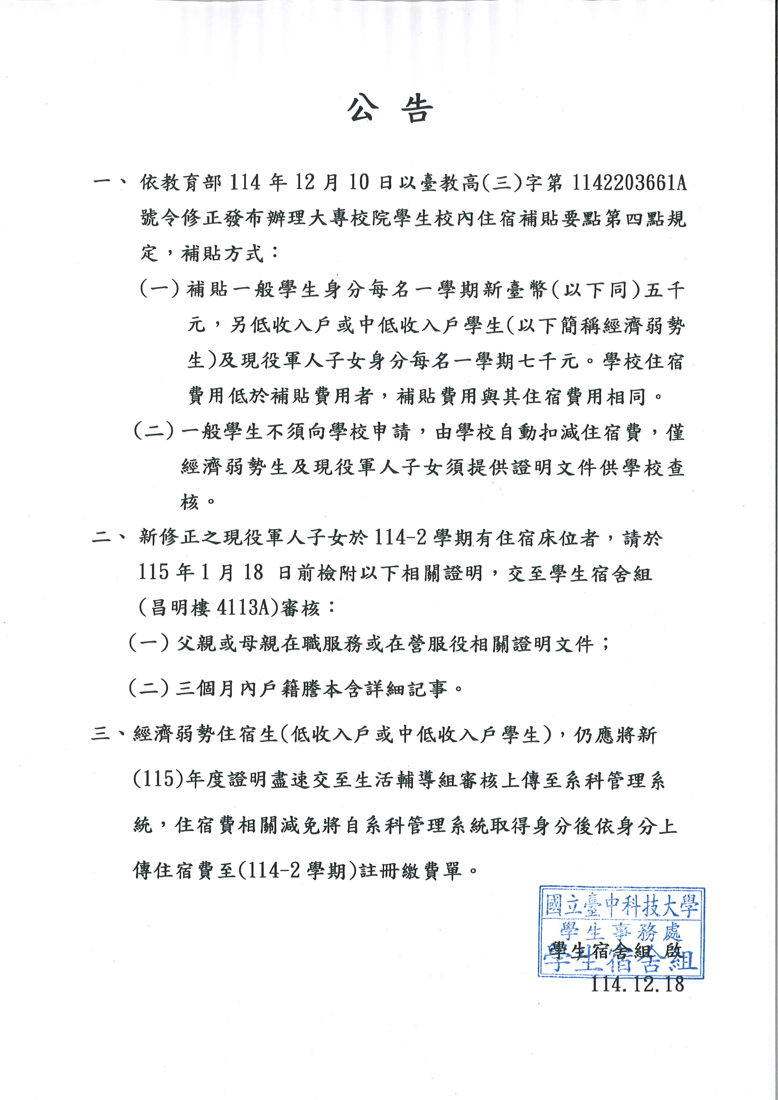現役軍人子女住宿費補貼自114-2學期起